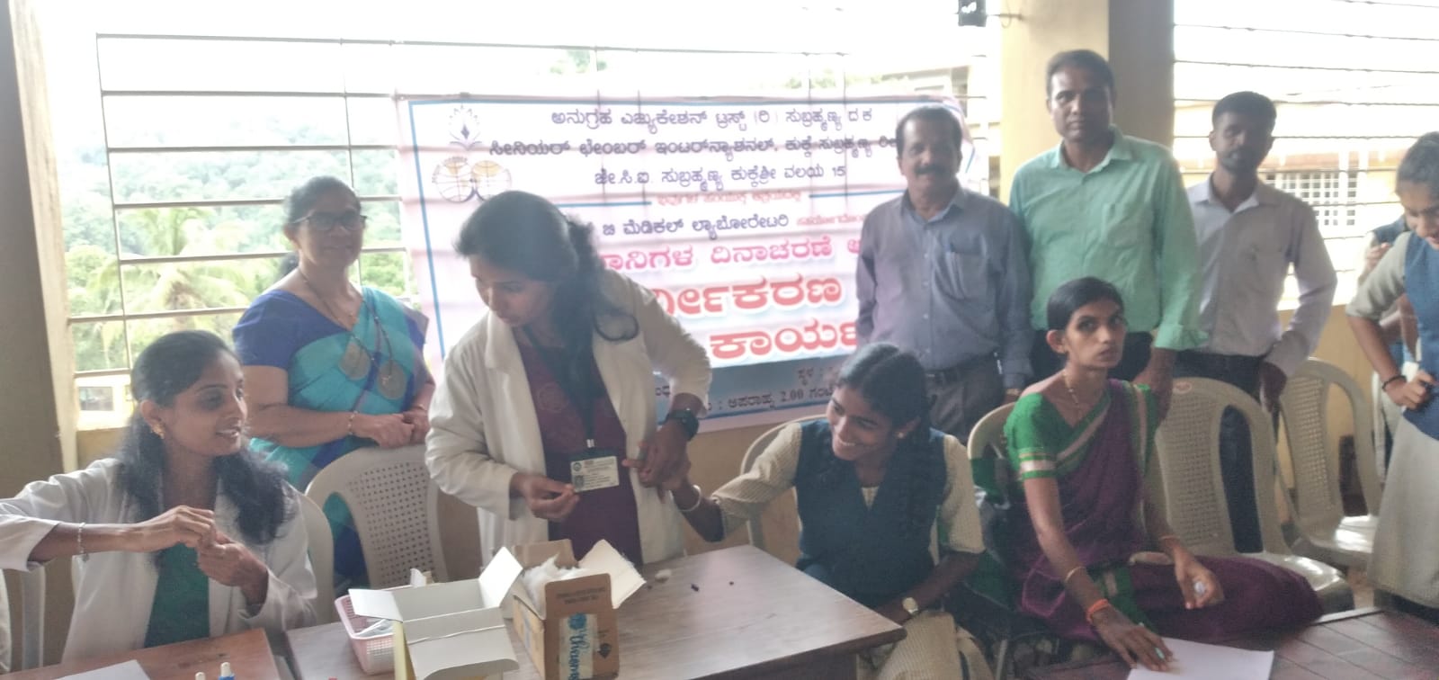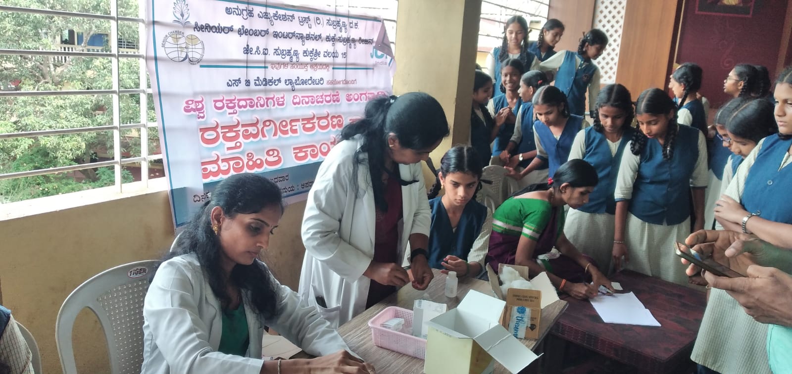 ಅನುಗ್ರಹ ಎಜುಕೇಶನ್ ಟ್ರಸ್ಟ್, ಸೀನಿಯರ್ ಚೇಂಬರ್ ಇಂಟರ್ನ್ಯಾಷನಲ್ ಕುಕ್ಕೆ ಶ್ರೀ ಸುಬ್ರಹ್ಮಣ್ಯ ಲಿಜನ್, ಹಾಗೂ ಜೆಸಿಐ ಸುಬ್ರಹ್ಮಣ್ಯ ಕುಕ್ಕೆ ಶ್ರೀ, ಇವರ ಜಂಟಿ ಆಶಯದಲ್ಲಿ ಎಸ್ ಬಿ ಲ್ಯಾಬೋರೇಟರಿ ಇವರ ಸಹಯೋಗದೊಂದಿಗೆ ಕುಮಾರಸ್ವಾಮಿ ವಿದ್ಯಾಲಯದಲ್ಲಿ ವಿಶ್ವ ರಕ್ತದಾನ ದಿನಾಚರಣೆಯ ಅಂಗವಾಗಿ ರಕ್ತ ವರ್ಗಿಕರಣ ಹಾಗೂ ಮಾಹಿತಿ ಶಿಬಿರವನ್ನು ಇಂದು ಬುಧವಾರ ಏರ್ಪಡಿಸಲಾಯಿತು.