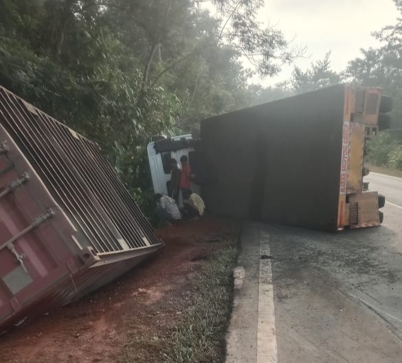 ಮಾಣಿ ಮೈಸೂರು ಹೆದ್ದಾರಿ ಬದಿಯಲ್ಲಿ ಸುಳ್ಯ ಕಡೆಯಿಂದ ಮಡಿಕೇರಿಗೆ ಹೋಗುತ್ತಿದ್ದ ಕಂಟೇನರ್ ಲಾರಿಯೊಂದು ಚಾಲಕನ ನಿಯಂತ್ರಣ ತಪ್ಪಿ ಕಲ್ಲುಗುಂಡಿ ಸಮೀಪ ಕಡಪ್ಪಾಲ ಬಳಿ ಪಲ್ಟಿಯಾದ ಘಟನೆ ನಿನ್ನೆ ತಡರಾತ್ರಿ ಸಂಭವಿಸಿದೆ.