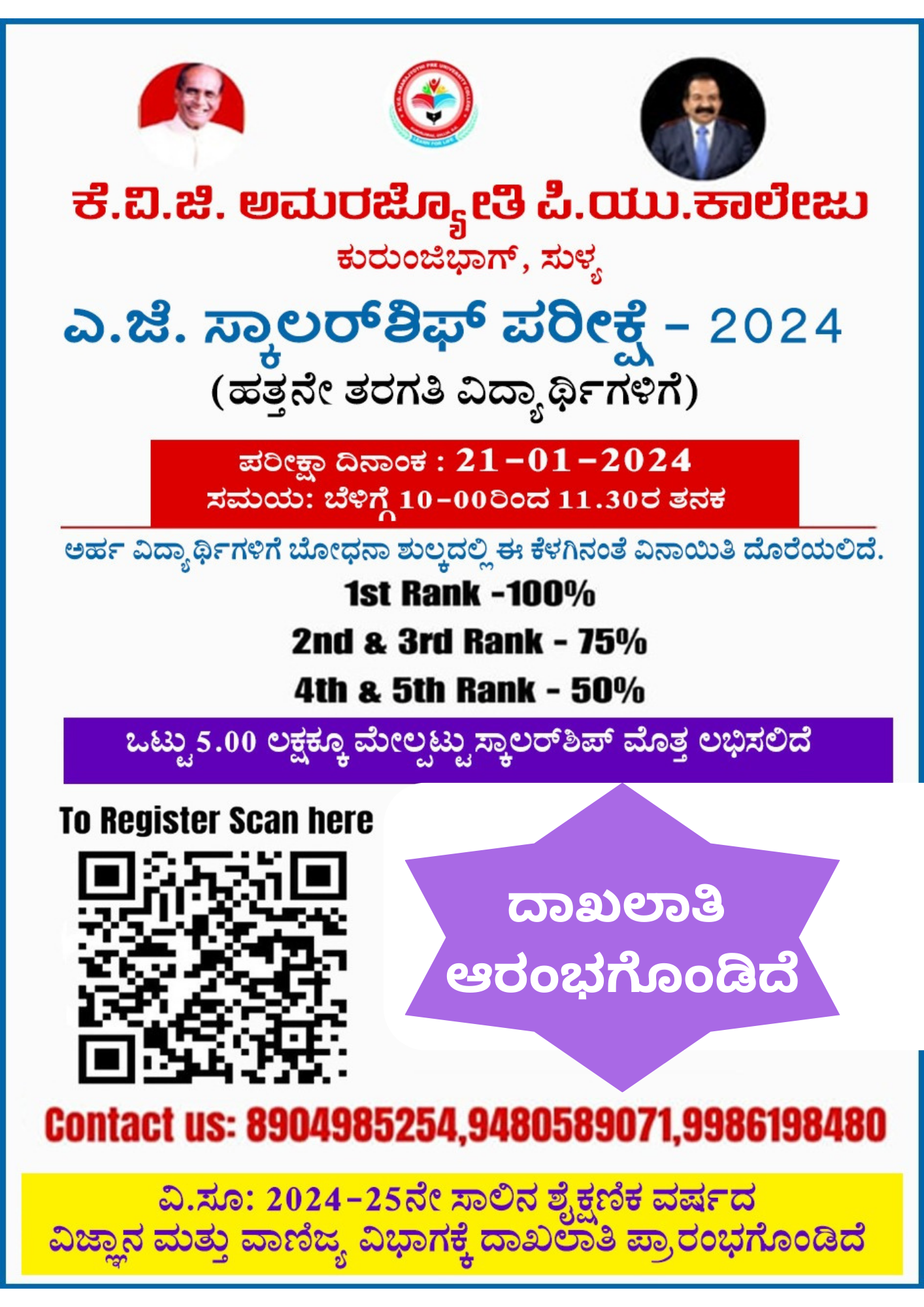 ಕೆವಿಜಿ ಅಮರಜ್ಯೋತಿ ಕಾಲೇಜಿನಲ್ಲಿ ಹತ್ತನೇ ತರಗತಿ ವಿದ್ಯಾರ್ಥಿಗಳಿಗೆ ಸ್ಕಾಲರ್ ಶಿರ್ಪ್ ಪರೀಕ್ಷೆಯನ್ನು ದಿನಾಂಕ 21 ಜನವರಿ 2024ರಂದು ನಡೆಸಲಾಗುವುದು. ಎಂದು ಸಂಸ್ಥೆ ಪ್ರಕಟಣೆ ತಿಳಿಸಿದೆ, ಆಸಕ್ತ ವಿದ್ಯಾರ್ಥಿಗಳು ಈ ಲಿಂಕ್ ಸ್ಕ್ಯಾನ್ ಮಾಡಿ ತಕ್ಷಣ ನೋಂದಾಯಿಸಿಕೊಳ್ಳಿರಿ.