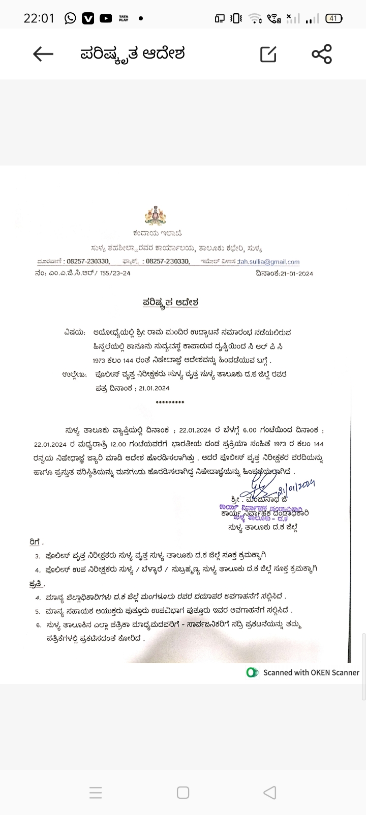 ಸುಳ್ಯ: ಅಯೋಧ್ಯೆಯ ಶ್ರೀರಾಮ ಮಂದಿರ ಲೋಕಾರ್ಪಣೆಯ ಹಿನ್ನಲೆಯಲ್ಲಿ ಅಹಿತಕರ ಘಟನೆ ನಡೆಯದಂತೆ ಮುಂಜಾಗೃತಾ ಕ್ರಮವಾಗಿ ಮತ್ತು ಕಾನೂನು ಶಾಂತಿ ಸುವ್ಯವಸ್ಥೆ ಕಾಪಾಡುವ ದೃಷ್ಟಿಯಿಂದ ಸುಳ್ಯ ತಾಲೂಕಿನಾದ್ಯಂತ ಜ.22 ರಂದು ನಿಷೇಧಾಜ್ಞೆ ಜಾರಿ ಮಾಡಿ ಸುಳ್ಯ ತಹಶೀಲ್ದಾರ್ ಆದೇಶ ಮಾಡಿದ್ದರು. ಆದರೆ ಆದೇಶವನ್ನು ವೆಬ್ ಸೈಟ್ ಮಾದ್ಯಮಗಳು ಸುದ್ದಿ ಮಾಡುತ್ತಿದ್ದಂತೆ, ಇದೀಗ ಆದೇಶ ಹಿಂಪಡೆದಿರುವುದಾಗಿ ಅಧಿಕಾರಿಗಳು ಮತ್ತೆ ಪ್ರಕಟಣೆ ಹೊರಡಿಸಿದ್ದಾರೆ.
