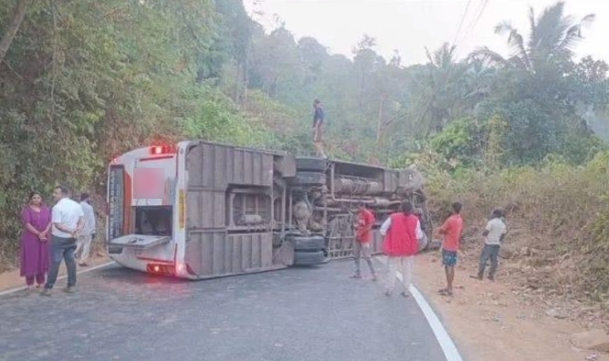 ಅರಂತೋಡು: ಬೆಂಗಳೂರಿನಿಂದ ಸುಳ್ಯಕ್ಕೆ ಬರುತ್ತಿದ್ದ ಖಾಸಗಿ ಬಸ್ ವಿದ್ಯುತ್ ಕಂಬವೊಂದಕ್ಕೆ ಢಿಕ್ಕಿ ಹೊಡೆದು ರಸ್ತೆಗೆ ಅಡ್ಡಲಾಗಿ ಪಲ್ಟಿಯಾಗಿ ರಸ್ತೆ ಬ್ಲಾಕ್ ಆದ ಘಟನೆ ಮಡಿಕೇರಿ ಸಮೀಪದ ಜೋಡುಪಾಲದಲ್ಲಿ ಸೋಮವಾರ ಮುಂಜಾನೆ 5:30 ರ ವೇಳೆ ಸಂಭವಿಸಿದೆ.