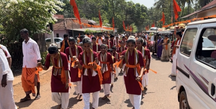 ಬೆಳಿಗ್ಗೆ ಅಯ್ಯಪ್ಪ ಸ್ವಾಮಿ ಭಜನಾ ಮಂದಿರದಿಂದ ಹೊರಟ ಹಸಿರುವಾಣಿ ಮೆರವಣಿಗೆಯ ವಾಹನದ ಮುಂದೆ ತೆಂಗಿನ ಕಾಯಿ ಒಡೆಯುವ ಮೂಲಕ ದೇಗುಲದ ಜೀರ್ಣೋದ್ಧಾರ ಸಮಿತಿಯ ಅಧ್ಯಕ್ಷ ಸದಾನಂದ ಮಾವಜಿ ಮೆರವಣಿಗೆಗೆ ಚಾಲನೆ ನೀಡಿದರು.