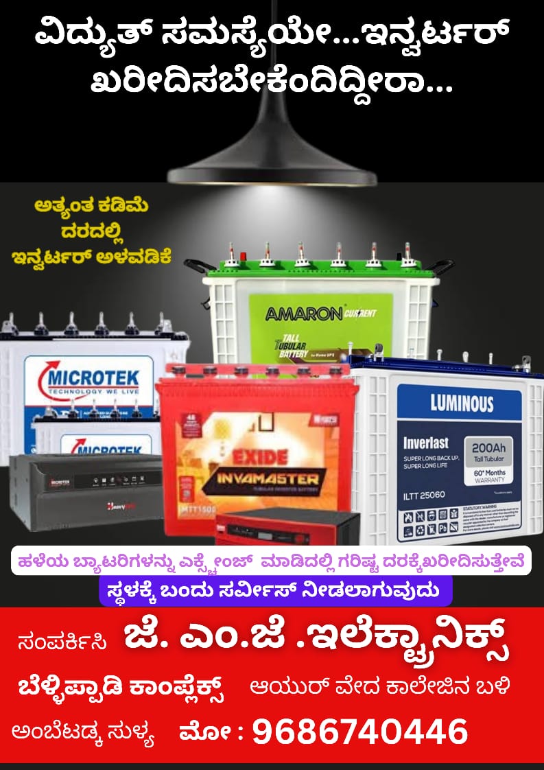 ಹಾಗಾಗಿ ಸುಳ್ಯದ ಅಂಬೆಟಡ್ಕ ಆಯುರ್ವೇದ ಕಾಲೇಜು ಮುಂಬಾಗ ಎ.ಪಿ.ಎಂ.ಸಿ ಬಳಿ “ಜೆ .ಎಂ.ಜೆ ” ಇಲೆಕ್ಟ್ರಾನಿಕ್ಸ್ ಸುಳ್ಯದ ಜನತೆಗಾಗಿ ಇನ್ವರ್ಟರ್ ಖರೀದಿಗೆ ಭಾರೀ ರಿಯಾಯಿತಿ ನೀಡಲಿದೆ, ಗ್ರಾಹಕರ ಮನೆಗೇ ಬಂದು ಇನ್ವರ್ಟರ್ ಅಳವಡಿಸುವ ಇವರು ಹಳೆಯ ಇನ್ವರ್ಟರ್ ರಿಪೇರಿಯನ್ನೂ ಮಾಡುತ್ತಾರೆ.ಇನ್ವರ್ಟರ್ ಸರಿಯಾಗಿದ್ದು ಬ್ಯಾಟರೀ ಮಾತ್ರ ಬದಲಾಯಿಸುವ ಗ್ರಾಹಕರಿಗೆ ಹಳೆಯ ಬ್ಯಾಟರಿಗೆ ಗರಿಷ್ಟ ದರ ನೀಡಿ ಎಕ್ಸಚೇಂಜ್ ಮಾಡುವುದಾಗಿ ಸಂಸ್ಥೆ ಪ್ರಕಟಣೆ ಹೊರಡಿಸಿದೆ.