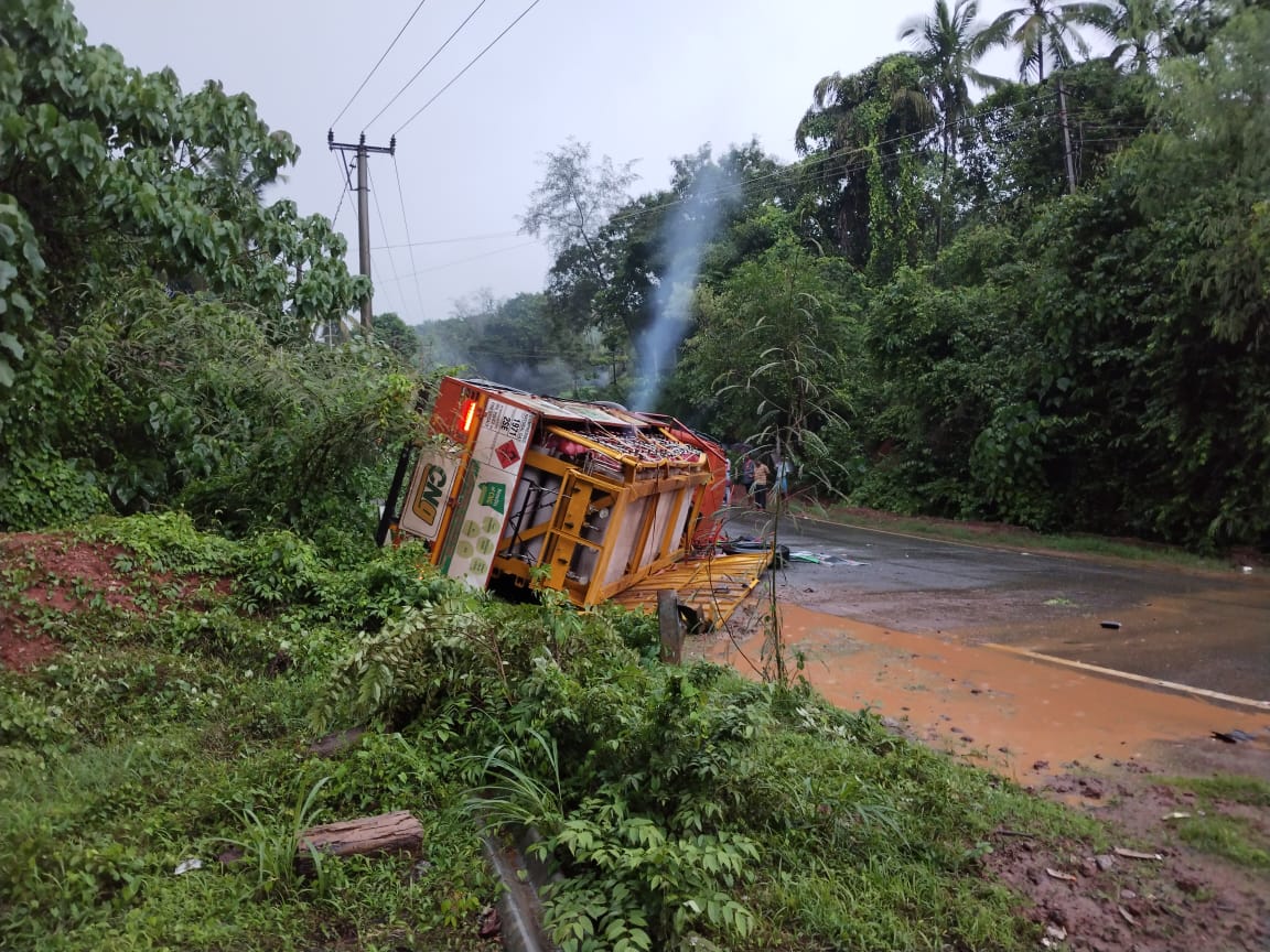 ಮಡಿಕೇರಿ ಕಡೆಯಿಂದ ಮಂಗಳೂರಿಗೆ ಗ್ಯಾಸ್ ಸಿಲಿಂಡರ್ ಸಾಗಾಟ ಮಾಡುತ್ತಿದ್ದ ಲಾರಿ ಜೋರಾಗಿ ಸುರಿಯುವ ಮಳೆಯ ಮಧ್ಯೆ ತಿರುವಿನಲ್ಲಿ ಚಾಲಕನ ನಿಯಂತ್ರಣ ತಪ್ಪಿ ಪಲ್ಟಿಯಾಗಿದ್ದು, ಸಿಲಿಂಡರ್ ನಿಂದ ಗ್ಯಾಸ್ ಸೋರಿಕೆಯಾಗುತ್ತಿರುವುದಾಗಿ ತಿಳಿದುಬಂದಿದೆ.ಈ ಹಿನ್ನೆಲೆಯಲ್ಲಿ ರಸ್ತೆ ಸಂಚಾರ ಅಸ್ತವ್ಯಸ್ತಗೊಂಡಿರುವುದಾಗಿ ತಿಳಿದುಬಂದಿದೆ. ಇದೀಗ ಸ್ಥಳಕ್ಕೆ ಸುಳ್ಯ ಅಗ್ನಿಶಾಮಕ ದಳದ ಸಿಬ್ಬಂದಿಗಳು ಆಗಮಿಸಿದ್ದು, ಕಾರ್ಯಾಚರಣೆಯಲ್ಲಿ ತೊಡಗಿರುವುದಾಗಿ ತಿಳಿದುಬಂದಿದೆ