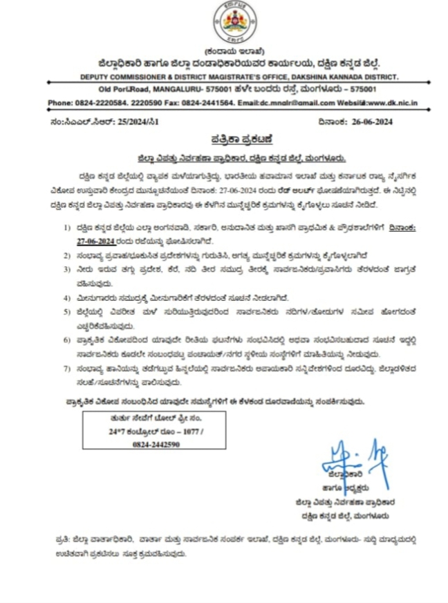 ಭಾರತೀಯ ಹವಾಮಾನ ಇಲಾಖೆ ಮತ್ತು ಕರ್ನಾಟಕ ರಾಜ್ಯ ನೈಸರ್ಗಿಕ ವಿಕೋಪ ಉಸ್ತುವಾರಿ ಕೇಂದ್ರದ ಮುನ್ಸೂಚನೆಯಂತೆ ಜೂನ್ 27 ರಂದು ರೆಡ್ ಅಲರ್ಟ್ ಘೋಷಣೆಯಾಗಿದ್ದು, ಈ ಹಿನ್ನೆಲೆಯಲ್ಲಿ ಮುನ್ನೆಚ್ಚರಿಕಾ ಕ್ರಮವಾಗಿ ದಕ್ಷಿಣ ಕನ್ನಡ ಜಿಲ್ಲಾಧಿಕಾರಿ ಮುಲ್ಲೈ ಮುಹಿಲನ್ ಶಾಲೆಗಳಿಗೆ ರಜೆ ಘೋಷಿಸಿದ್ದಾರೆ.