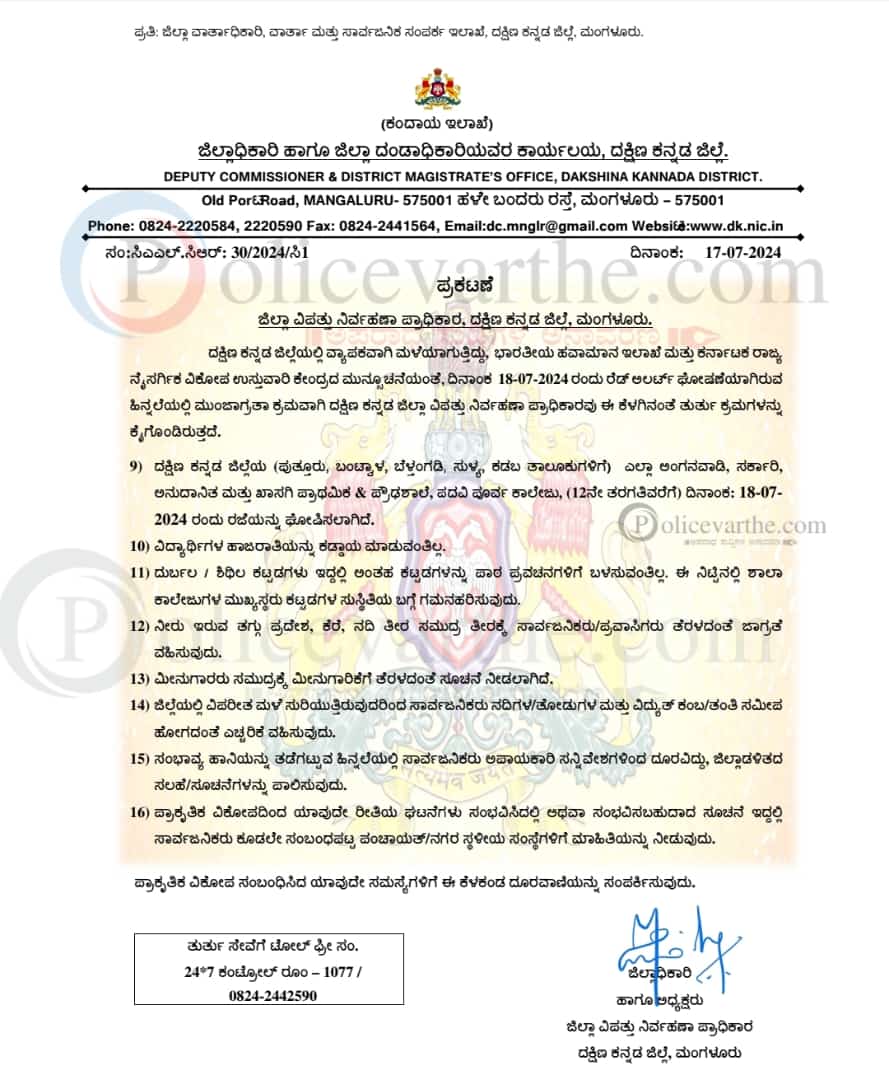 ಮಂಗಳೂರು ಜುಲೈ 17 : ದಕ್ಷಿಣಕನ್ನಡ ಜಿಲ್ಲೆಯಲ್ಲಿ ಮಳೆ ಮುಂದುವರೆದಿದ್ದು, ಹವಾಮಾನ ಇಲಾಖೆ ರೆಡ್ ಅಲರ್ಟ್ ಘೋಷಿಸಿದೆ. ಈ ಹಿನ್ನಲೆ ದಕ್ಷಿಣ ಕನ್ನಡ ಜಿಲ್ಲೆಯ ಪುತ್ತೂರು, ಬಂಟ್ವಾಳ, ಬೆಳ್ತಂಗಡಿ, ಸುಳ್ಯ ಹಾಗೂ ಕಡಬ ತಾಲೂಕು ವ್ಯಾಪ್ತಿಯ ಅಂಗನವಾಡಿ, ಶಾಲೆಗಳು ಹಾಗೂ ಪದವಿ ಪೂರ್ವ ಕಾಲೇಜು ತನಕದ ಶಿಕ್ಷಣ ಸಂಸ್ಥೆಗಳಿಗೆ ಜುಲೈ 18 ಗುರುವಾರ ದ.ಕ. ಜಿಲ್ಲಾಧಿಕಾರಿ ಮುಲ್ಲೈ ಮುಗಿಲನ್ ರಜೆ ಘೋಷಿಸಿದ್ದಾರೆ.