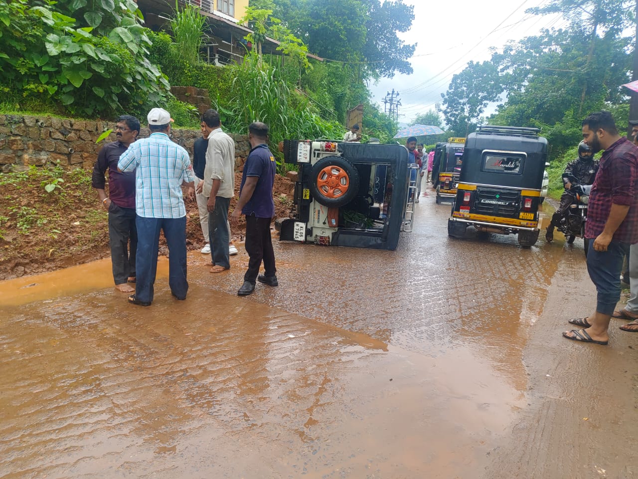 ಡಿಕ್ಕಿಯಾದ ಸಂದರ್ಭ ಜೀಪು ಪಲ್ಟಿಯಾಗಿದೆ.
