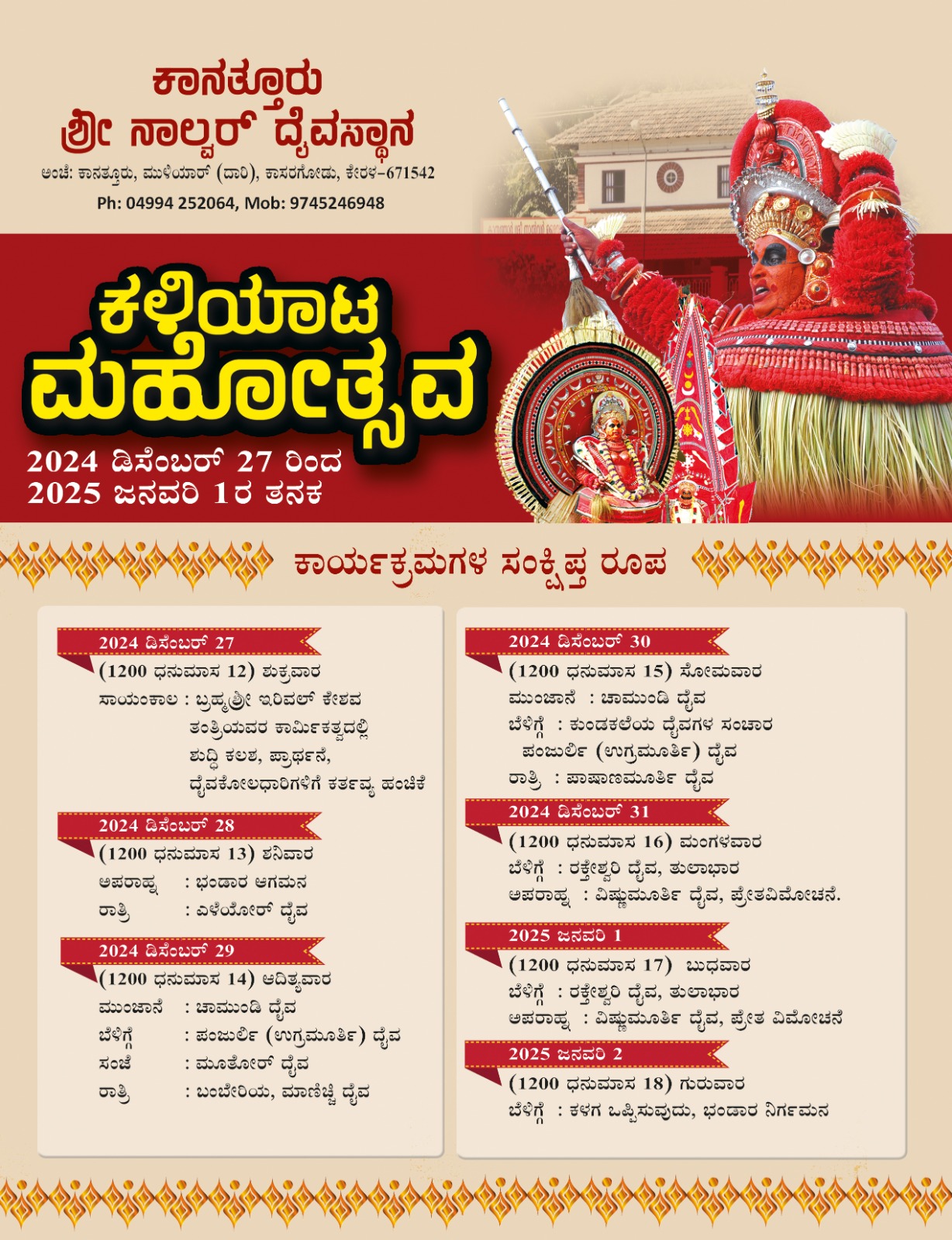 ಕಾನತ್ತೂರು ಶ್ರೀ ನಾಲ್ವರ್ ದೈವಸ್ಥಾನದಲ್ಲಿ ನಡೆಯುವ ಕಾಲಾವಧಿ ಕಳಿಯಾಟ ಮಹೋತ್ಸವವು ಡಿಸೆಂಬರ್ 27 ರಿಂದ ಜನವರಿ 01 ರ ವರೆಗೆ ನಡೆಯಲಿದ್ದು ದಿನಾಂಕ 27-12-2024 ರಂದು ಶುಕ್ರವಾರ ಸಾಯಂಕಾಲ ಬ್ರಹ್ಮಶ್ರೀ ಇರಿವಲ್ ಕೇಶವ ತಂತ್ರಿಯವರ ಕಾರ್ಮಿಕತ್ವದಲ್ಲಿ ಶುದ್ಧಿ ಕಲಶ , ಪ್ರಾರ್ಥನೆ, ದೈವಕೋಲಧಾರಿಗಳಿಗೆ ಕರ್ತವ್ಯ ಹಂಚಿಕೆಯ ಮೂಲಕ ಆರಂಭಗೊಂಡು ಜನವರಿ 1 ರ ವರೆಗೆ ವಿಜೃಂಭಣೆ ಯಿಂದ ನಡೆಯಲಿದೆ.