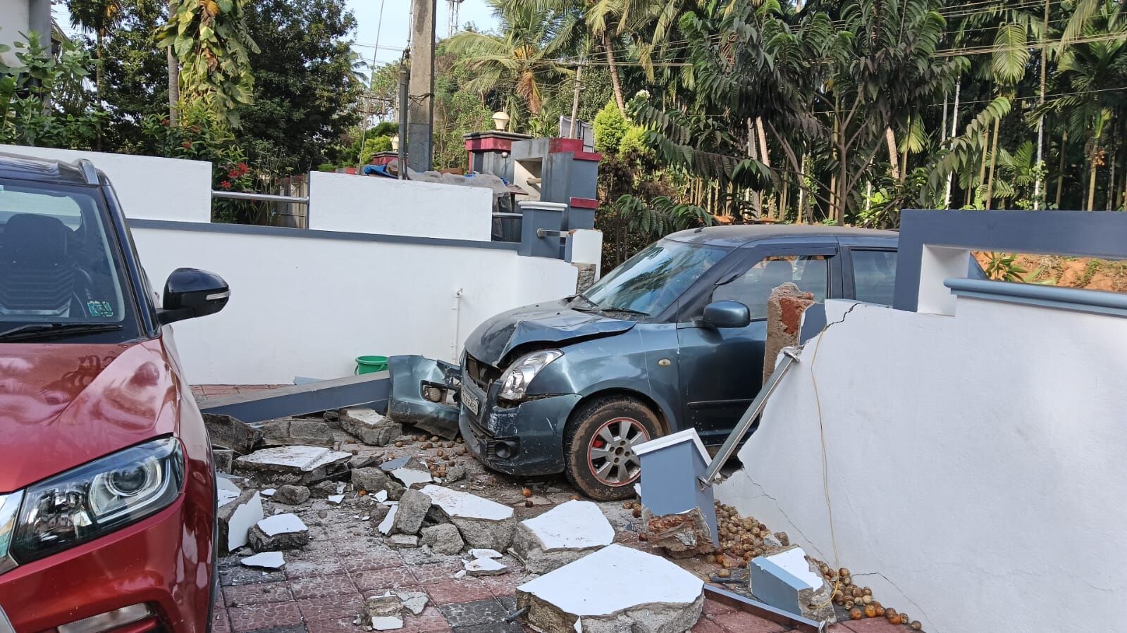 ಬಂಟ್ವಾಳ : ಕಾರೊಂದು ಮನೆಯ ಕಂಪೌಂಡ್ ಗೋಡೆ ಬೇಧಿಸಿ ಒಳನುಗ್ಗಿ ಆವರಣಗೋಡೆ ಪುಡಿಗಟ್ಟಿದ್ದಲ್ಲದೆ ಮನೆಯಂಗಳ ದಲ್ಲಿ ನಿಲ್ಲಿಸಿದ್ದ ಕಾರಿಗೂ ಹಾನಿಯಾದ ಘಟನೆ ಸಜಿಪಮೂಡ ಗ್ರಾಮದ ಪಣೋಲಿಬೈಲು ಕ್ರಾಸ್ ಬಳಿ ಸೋಮವಾರ ತಡ ರಾತ್ರಿ ಸಂಭವಿಸಿದೆ. ಇಲ್ಲಿನ ನಿವಾಸಿ ನಝೀರ್ ಹಾಜಿ ಎಂಬವರ ಮನೆಯಲ್ಲಿ ಈ ದುರಂತ ಸಂಭವಿಸಿದ್ದು, ಕಾರು ಚಾಲಕನ ಬಗ್ಗೆ ಮಾಹಿತಿ ಲಭ್ಯವಾಗಿಲ್ಲ.