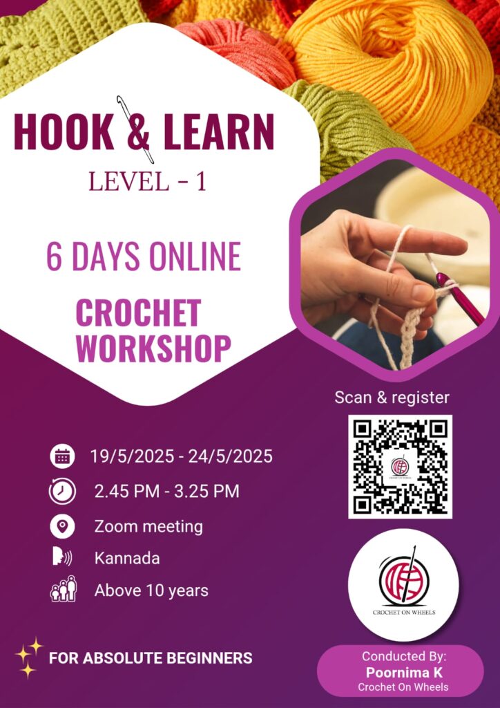ಬೆಂಗಳೂರು: ಕ್ರೋಶ ಕಲಿಯಲು ಆಸಕ್ತರಾದ ಪ್ರಾರಂಭಿಕರಿಗೆ ಉತ್ತಮ ಅವಕಾಶ. “Hook & Learn – Level 1” ಎಂಬ ಶೀರ್ಷಿಕೆಯಲ್ಲಿ ಆನ್‌ಲೈನ್‌ ಕ್ರೋಶ ಕಾರ್ಯಾಗಾರವನ್ನು ಆಯೋಜಿಸಲಾಗಿದೆ. ಮೇ 19ರಿಂದ 24ರ ತನಕ 6 ದಿನಗಳ ಕಾಲ ಈ ವರ್ಕ್‌ಶಾಪ್ ನಡೆಯಲಿದೆ.