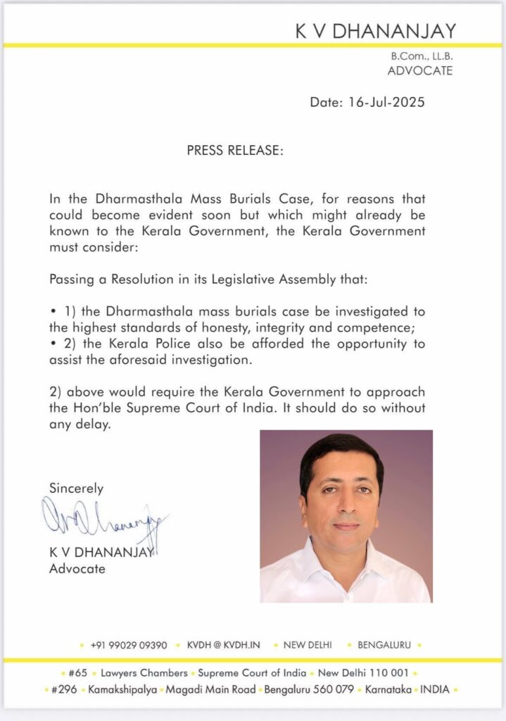 ನೂರಾರು ಯುವತಿಯರ ದೇಹವನ್ನು ಧರ್ಮಸ್ಥಳದಲ್ಲಿ ಧಪನ ಮಾಡಿದ್ದೇನೆ ಎಂದು ಹೇಳಿಕೆ ಕೊಟ್ಟ ವ್ಯಕ್ತಿ ತನ್ನ ಬಳಿ ಇರುವ ಅಸ್ತಿಪಂಜರವನ್ನು ಪೊಲೀಸರಿಗೆ ಕೊಟ್ಟು 15 ದಿನ ಕಳೆದರೂ ಇನ್ನೂ ವ್ಯಕ್ತಿ ಹೇಳಿದ ಸ್ಥಳದಲ್ಲಿ ಅಗೆದು ತನಿಖೆ ನಡೆಸಲು ವಿಳಂಬ ಮಾಡುತ್ತಿರುವ ಪೊಲೀಸ್ ಇಲಾಖೆ ವಿರುದ್ಧ ಸುಪ್ರೀಂ ಕೋರ್ಟ್ ಅಡ್ವೊಕೇಟ್ ಕೆ ವಿ ಧನಂಜಯ್ ತೀವ್ರ ಆಕ್ರೋಶ ವ್ಯಕ್ತಪಡಿಸಿದ್ದಾರೆ.