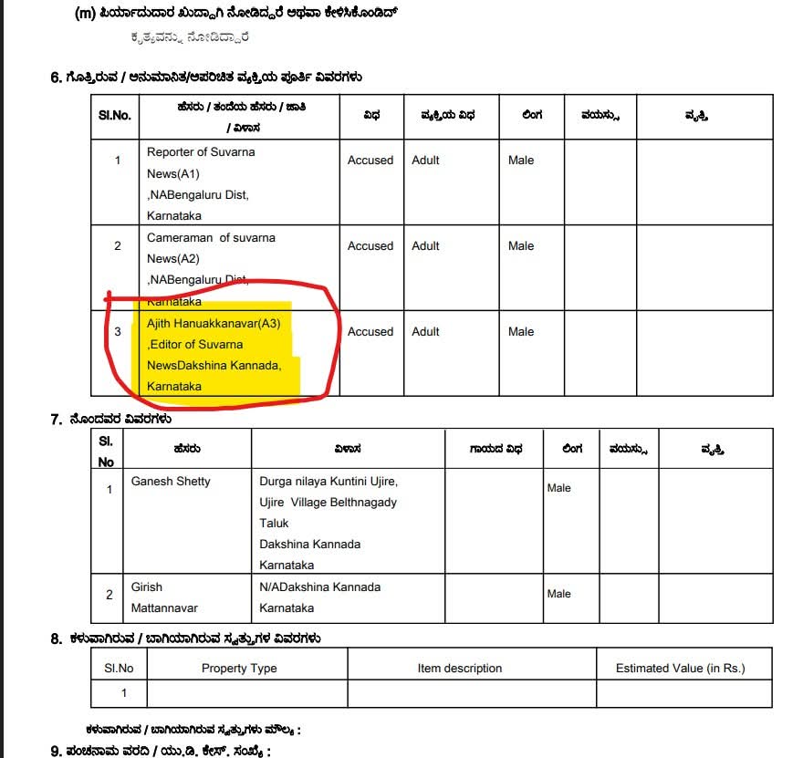 ಧರ್ಮಸ್ಥಳದಲ್ಲಿ ನಿನ್ನೆ ನಡೆದ ಯೂಟ್ಯೂಬರ್ ಗಳ ಮೇಲಿನ ಹಲ್ಲೆಗಳನ್ನು ಸಮರ್ಥಿಸಿ ಪತ್ರಿಕಾ ಧರ್ಮ ಮರೆತು ಧರ್ಮದೇಟು ಎಂದು ಲೇವಡಿ ಮಾಡಿ ತನ್ನ ಚಾನೆಲ್ ನ ವರದಿಗಾರ ಮತ್ತು ಕ್ಯಾಮೆರಾ ಮ್ಯಾನ್ ಗೆ ಮಹೇಶ್ ಶೆಟ್ಟಿ ತಿಮರೋಡಿ ಮತ್ತು ಗಿರೀಶ್ ಮಟ್ಟಣ್ಣನವರ್ ಹಲ್ಲೆ ಮಾಡಿದ್ದಾರೆ ಎಂದು ಸುಳ್ಳು ಸುದ್ದಿ ಮಾಡಿದ ಆರೋಪದಲ್ಲಿ ಸುವರ್ಣ ನ್ಯೂಸ್ ನ ಅಜಿತ್ ಹನುಮಕ್ಕನವರ್ ವಿರುದ್ಧ ಬೆಳ್ತಂಗಡಿ ಠಾಣೆಯಲ್ಲಿ ಎಫ್ ಐ ಆರ್ ದಾಖಲಾಗಿದೆ. ಪ್ರತ್ಯಕ್ಷದರ್ಶಿ ಉಜಿರೆಯ ಗಣೇಶ್ ಶೆಟ್ಟಿ ಎಂಬವರ ದೂರಿನ ಮೇರೆಗೆ ಎಫ್ ಐ ಆರ್ ದಾಖಲಾಗಿದೆ ಎಂದು ತಿಳಿದು ಬಂದಿದೆ.