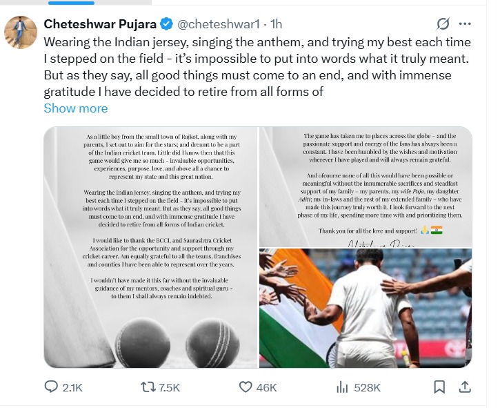 ಪೂಜಾರಾ ತಮ್ಮ ಭಾವನಾತ್ಮಕ ಸಂದೇಶದಲ್ಲಿ ಹೇಳಿದರು: “ಭಾರತೀಯ ಜೆರ್ಸಿ ಧರಿಸುವುದು, ರಾಷ್ಟ್ರಗೀತೆ ಹಾಡುವುದು, ಮೈದಾನಕ್ಕೆ ಕಾಲಿಡುವ ಪ್ರತಿ ಸಾರಿ ನನ್ನ ಶ್ರೇಷ್ಠತೆಯನ್ನು ತೋರಿಸಲು ಪ್ರಯತ್ನಿಸುವುದು – ಇದಕ್ಕೆ ಅರ್ಥ ಹೇಳುವುದೇ ಅಸಾಧ್ಯ. ಆದರೆ ಎಲ್ಲ ಒಳ್ಳೆಯ ಸಂಗತಿಗಳಿಗೂ ಅಂತ್ಯವಿರುತ್ತದೆ ಎಂದು ಹೇಳುತ್ತಾರೆ, ಅಪಾರ ಕೃತಜ್ಞತೆಯಿಂದ ನಾನು ಎಲ್ಲಾ ಮಾದರಿಯ ಭಾರತೀಯ ಕ್ರಿಕೆಟ್ನಿಂದ ನಿವೃತ್ತಿ ಘೋಷಿಸುತ್ತಿದ್ದೇನೆ” ಎಂದು ಬರೆದು ಕೊಂಡರು.