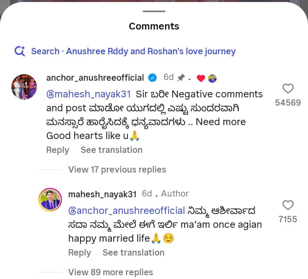 ಈ ಹಾರೈಕೆಗೆ ಪ್ರತಿಕ್ರಿಯೆ ನೀಡಿದ ಅನುಶ್ರೀ, “ಬರೀನೆಗೆಟಿವ್ ಕಾಮೆಂಟ್ಗಳ ಯುಗದಲ್ಲಿ ಹೃದಯದಿಂದ ಇಷ್ಟು ಸುಂದರವಾಗಿ ಹಾರೈಸಿದಕ್ಕೆ ಧನ್ಯವಾದಗಳು. ನಿಮ್ಮಂತವರು ಇನ್ನಷ್ಟು ಜನ ಬೇಕಾಗಿದ್ದಾರೆ” ಎಂದು ತಿಳಿಸಿದ್ದಾರೆ.