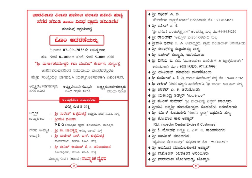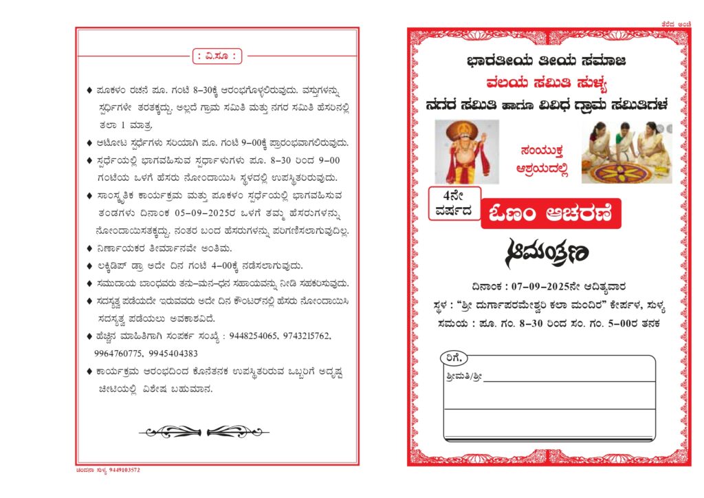 ಭಾರತೀಯ ತೀಯ ಸಮಾಜ ಸುಳ್ಯ ವಲಯ, ನಗರ ಮತ್ತು ವಿವಿಧ ಗ್ರಾಮ ಸಮಿತಿಯ ಜಂಟಿ ಆಶ್ರಯ ದಲ್ಲಿ ನಾಲ್ಕನೇ ವರುಷ ದ ಓಣಂ ಆಚರಣೆ ಯು ದಿನಾಂಕ 07-09-2025 ನೆ ಭಾನುವಾರ ಶ್ರೀ ದುರ್ಗಾಪರಮೇಶ್ವರಿ ಕಲಾಮಂದಿರ ಕೇರ್ಪಳ ದಲ್ಲಿ ನಡೆಯಲಿದೆ.