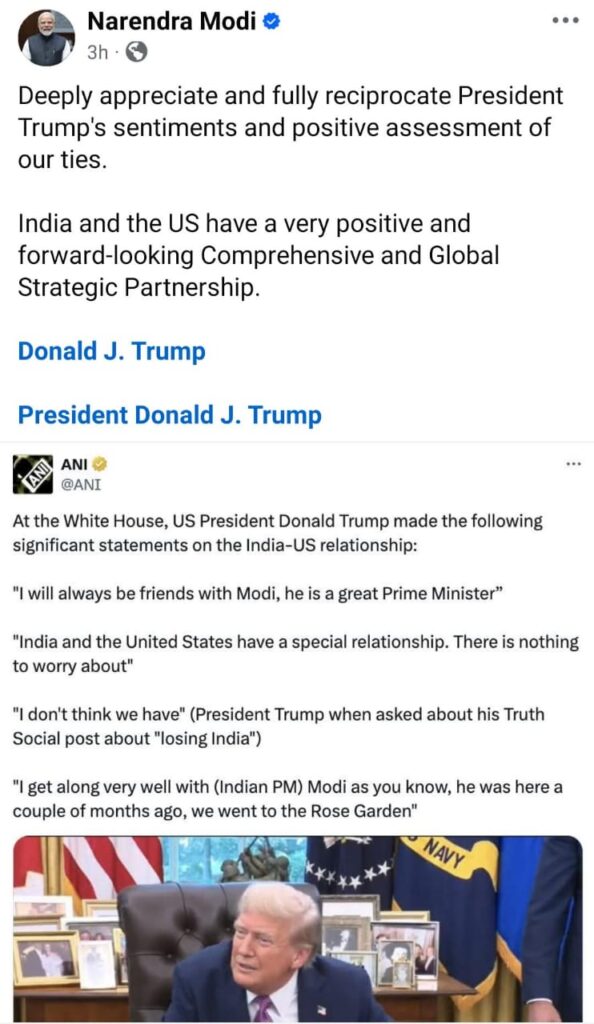 ಅಮೆರಿಕಾ ಅಧ್ಯಕ್ಷರ ಹೇಳಿಕೆಗೆ ಪ್ರತಿಕ್ರಿಯೆ ನೀಡಿದ ಮೋದಿ ಅವರು, ಸಾಮಾಜಿಕ ಜಾಲತಾಣದಲ್ಲಿ ಪೋಸ್ಟ್ ಮಾಡುತ್ತಾ, “ಅಮೆರಿಕಾ ಅಧ್ಯಕ್ಷ ಟ್ರಂಪ್ ಅವರ ಭಾವನೆಗಳು ಮತ್ತು ಭಾರತ–ಅಮೆರಿಕಾ ಸಂಬಂಧಗಳ ಕುರಿತು ನೀಡಿದ ಸಕಾರಾತ್ಮಕ ಅಭಿಪ್ರಾಯವನ್ನು ನಾನು ಮೆಚ್ಚುತ್ತೇನೆ” ಎಂದು ತಿಳಿಸಿದ್ದಾರೆ.