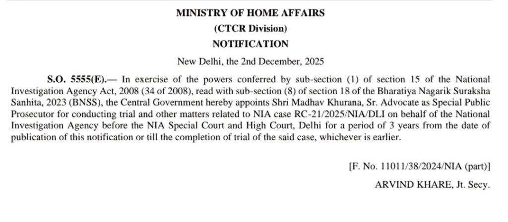 ನವದೆಹಲಿ(ಡಿ.3): ನವೆಂಬರ್ 10 ರಂದು ಕೆಂಪುಕೋಟೆಯ ಬಳಿ ಸಂಭವಿಸಿದ ಭೀಕರ ಕಾರು ಸ್ಫೋಟ ಪ್ರಕರಣದ ವಿಚಾರಣೆ ಮತ್ತು ಇತರ ಕಾನೂನು ಪ್ರಕ್ರಿಯೆಗಳನ್ನು ನಡೆಸಲು ಹಿರಿಯ ವಕೀಲ ಮಾಧವ್ ಖುರಾನಾ ಅವರನ್ನು ವಿಶೇಷ ಸರ್ಕಾರಿ ಅಭಿಯೋಜಕ (Special Public Prosecutor) ಆಗಿ ಕೇಂದ್ರ ಗೃಹ ಸಚಿವಾಲಯವು ನೇಮಕ ಮಾಡಿದೆ.