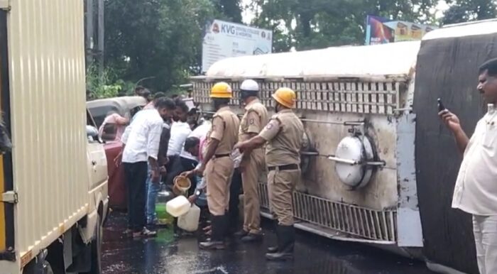ಬೈತಡ್ಕ ತಿರುವಿನಲ್ಲಿ ಟ್ಯಾಂಕರ್ ಪಲ್ಟಿ -ಡೀಸೆಲ್ ಸೋರಿಕೆ. :ಕೊಡಪಾನ, ಕ್ಯಾನ್ ಬಕೆಟ್ ನಲ್ಲಿ ಡೀಸೆಲ್ ತುಂಬಿಸಿಕೊಳ್ಳಲು ಮುಗಿಬಿದ್ದ ಜನ..