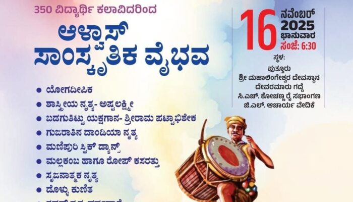ಪುತ್ತೂರು: ಆಳ್ವಾಸ್ ಎಜುಕೇಷನ್ ಫೌಂಡೇಶನ್ ಮತ್ತು ಆಳ್ವಾಸ್ ನುಡಿಸಿರಿ ವಿರಾಸತ್ ಪುತ್ತೂರು ಘಟಕದ ಆಶ್ರಯದಲ್ಲಿ ನವೆಂಬರ್ 16, 2025 (ಭಾನುವಾರ) ರಂದು ಭವ್ಯ ಸಾಂಸ್ಕೃತಿಕ ವೈಭವ ನೆರವೇರಲಿದೆ. 350 ವಿದ್ಯಾರ್ಥಿ ಕಲಾವಿದರ ಅಪಾರ ಪ್ರತಿಭೆಯನ್ನು ಒಳಗೊಂಡ ಮನಮೋಹಕ ಕಲಾಪ್ರದರ್ಶನಗಳು ಈ ಕಾರ್ಯಕ್ರಮದ ಪ್ರಮುಖ ಆಕರ್ಷಣೆಯಾಗಿವೆ. ಯೋಗದಿಂದ ನೃತ್ಯವರೆಗೆ, ಯಕ್ಷಗಾನದಿಂದ…