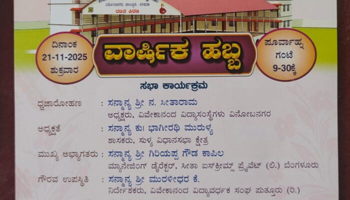 ರಾಷ್ಟೋತ್ಥಾನ ಶಿಶುಮಂದಿರ ಟ್ರಸ್ಟ್ (ರಿ.) ಆಶ್ರಯದಲ್ಲಿ ಕಾರ್ಯನಿರ್ವಹಿಸುತ್ತಿರುವ ವಿವೇಕಾನಂದ ವಿದ್ಯಾಸಂಸ್ಥೆಗಳು, ವಿನೋಬನಗರ, ಜಾಲ್ಸೂರು ಗ್ರಾಮ, ಸುಳ್ಯ ತಾಲೂಕು, ದಕ್ಷಿಣ ಕನ್ನಡ ಜಿಲ್ಲೆಯ ಈ ಸಂಸ್ಥೆಯ ವಾರ್ಷಿಕ ಹಬ್ಬವನ್ನು ನವೆಂಬರ್ 21, 2025 (ಶುಕ್ರವಾರ) ರಂದು ವೈಭವದಿಂದ ಆಚರಿಸಲು ಸಜ್ಜಾಗಿದೆ. ಬೆಳಿಗ್ಗೆ 9.30ಕ್ಕೆ ಧ್ವಜಾರೋಹಣ ಮತ್ತು ಸರಸ್ವತಿ ವಂದನೆ, ಬಳಿಕ…